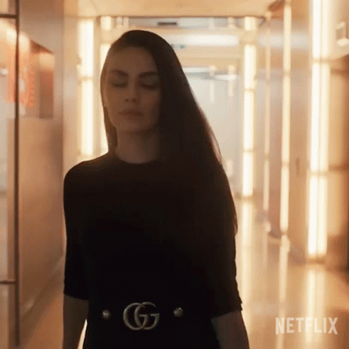 Mila Kunis as Ani Fanelli in 'Luckiest Girl Alive' walking with a side look in a hallway.