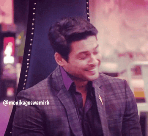 Sidharth Shukla smiling and chuckling while appearing on Bigg Boss 13, looking handsome in a suit.
