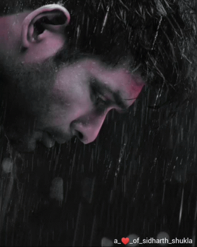 Sidharth Shukla looking pensive in the rain, with water droplets falling around him, evoking a dramatic mood.