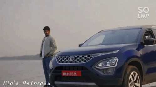 Sidharth Shukla poses next to a blue SUV, with animated fireworks in the background.