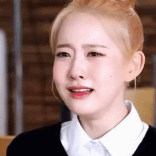 Sieun from STAYC is seen crying and looking down in a sad and emotional reaction.