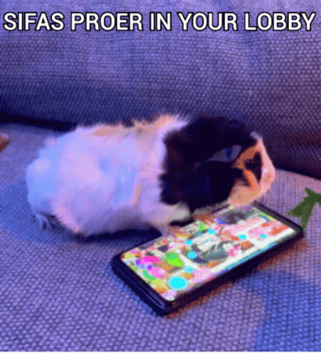 A cute guinea pig relaxes on a couch next to a smartphone displaying a colorful game, with 'Sifas Proer in Your Lobby' text.