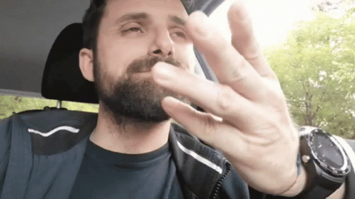 Bearded man in a car using sign language, expressing frustration with intense facial expressions.
