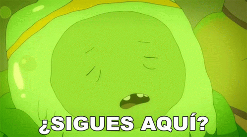 Finn, a green cartoon character from Hora De Aventura, looks sad with the Spanish text '¿Sigues Aquí?' (Are You Still Here?) below.