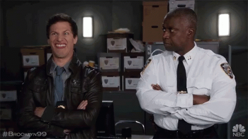 Andy Samberg as Jake Peralta makes a silly face next to Andre Braugher as Captain Raymond Holt from Brooklyn Nine-Nine.