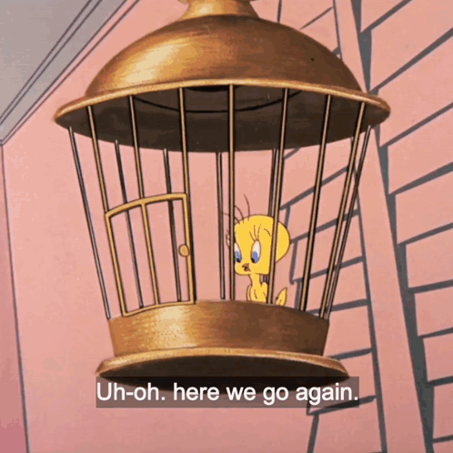 Tweety Bird in a cage as Sylvester the Cat attempts to catch him, with the caption 'Uh-oh. here we go again.'