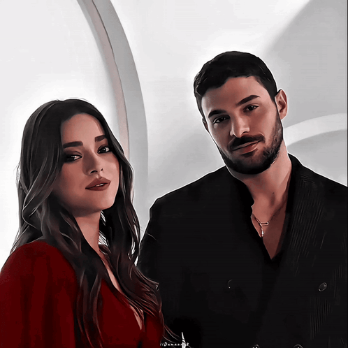 Simay Barlas and Halit özgür Sarı pose together, with Halit wearing a stylish necklace.
