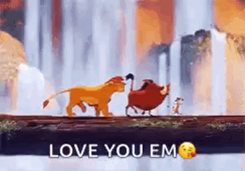 Simba, Pumbaa, and Timon from The Lion King dance happily with a waterfall and moon in the background, with 'LOVE YOU EM' text.