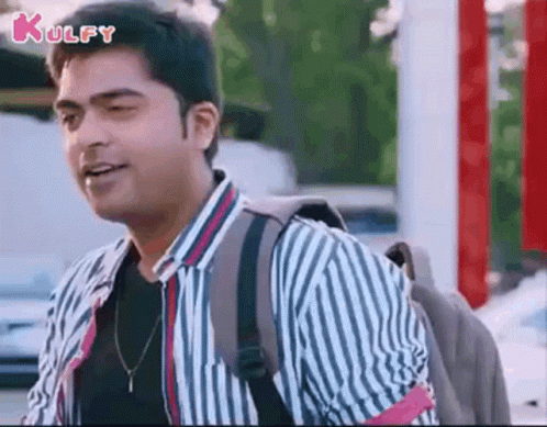 Simbhu STR, the popular Tamil actor, smiles charmingly while wearing a striped shirt and backpack.