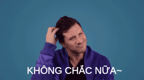 Simon Rex scratching his head in a purple jacket against a blue background with 'Không Chắc Nữa' (Not Sure) text.