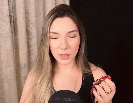 Monique Always makes the sign of the cross and prays with her eyes closed, holding a red rosary or beaded bracelet.