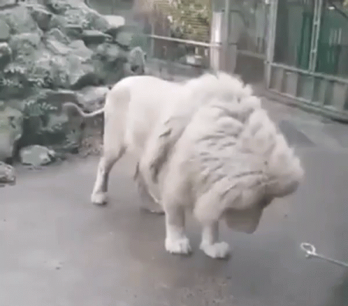A majestic white lion in a zoo enclosure gets startled by something off-camera, reacting with a sudden jump.