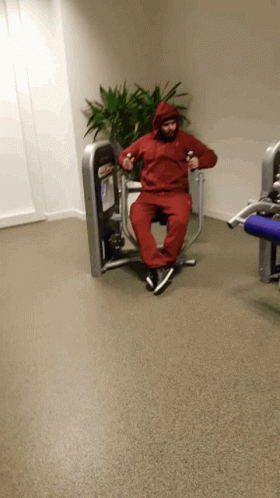 A man, identified as Singh, in a red hoodie and sweatpants, is working out on a chest press machine at the gym.