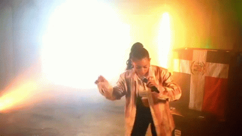 Danielle Leigh Curiel, also known as Danileigh, singing and performing on stage with a microphone, in front of a Dominican Republic flag.