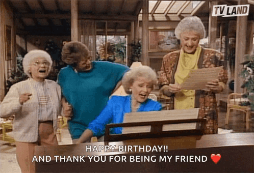 The Golden Girls, including Bea Arthur, Betty White, and Estelle Getty, joyfully sing 'Happy Birthday' and thank a friend.