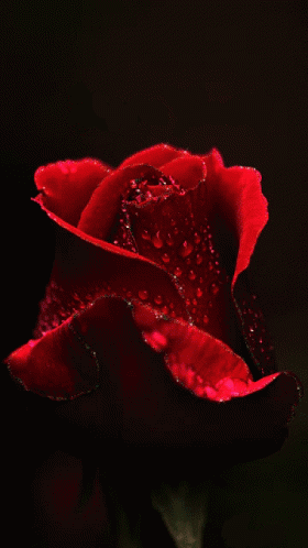 A beautiful single red rose covered in glistening water droplets, captured in a close-up shot against a dark background.