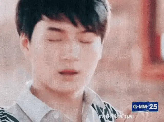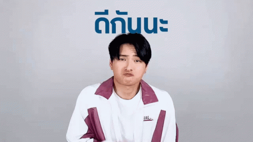 Singto Krist making funny faces and a finger heart gesture, with Thai text 'ดีกันนะ' (Let's make up) in the background.