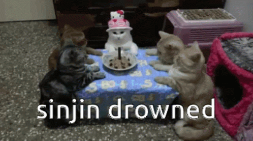 A group of cats, including Sinjindrowned's best friends, gather around a table with a Hello Kitty cake.
