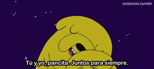 Finn and Jake from Adventure Time share a tender moment, with the affectionate phrase 'Tú y yo, pancita. Juntos para siempre.'