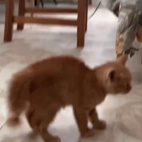An orange kitten, possibly named Persik, walks with an arched back and bristling fur, appearing scared or defensive.