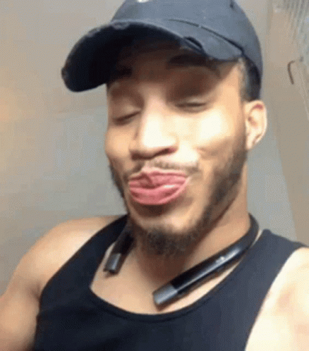 A man wearing a hat sips from a cup with a straw, making a humorous face, associated with the 'sipping tea' meme.