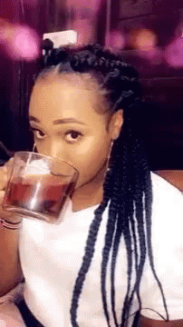 A woman with braided hair sips a drink from a glass, looking directly at the camera.