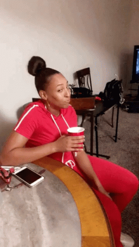 Woman in a red tracksuit sips from a red cup, making a 'sips tea' expression, then smiles knowingly.