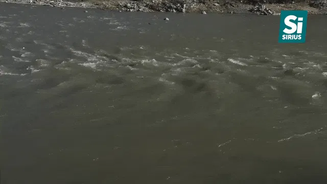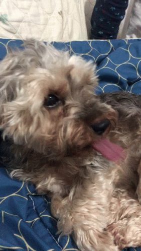 Sirius Sisi, the adorable fluffy dog, relaxing on a blue blanket and looking up at the camera.
