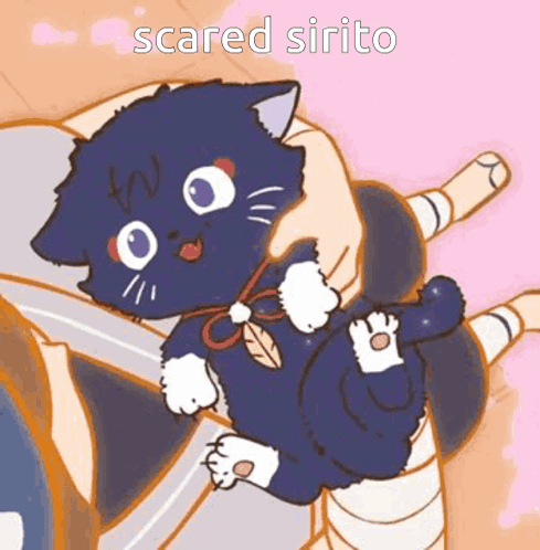 a person is holding a black cat with white paws and a leaf on its tail .