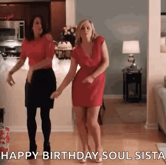 Two sisters in red dresses joyfully dancing in a living room, celebrating a 'Happy Birthday Soul Sista'.