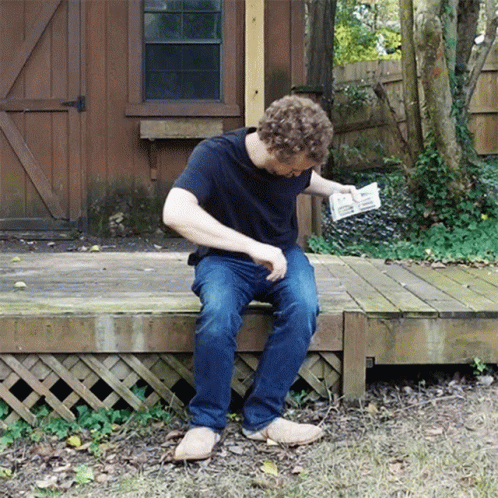 Peter Deligdisch sits on a wooden deck, looking at a small object in his hands.