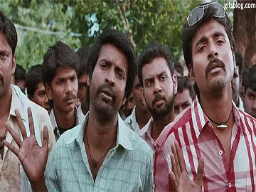 Siva Karthikeyan and a group of men react comically, exclaiming 'Aaaahhh....' in a scene from a Tamil film.