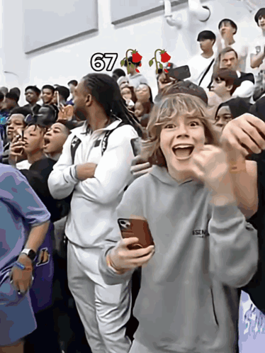 Mason67, a young boy, reacts with wide-eyed excitement in a crowd, holding a phone, with '67' visible.