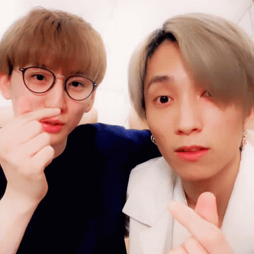 Sixtones members Tanaka Juri and Kyomoto Taiga make heart gestures and smile for the camera.