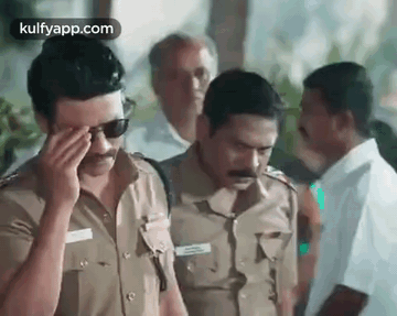 Sj Surya, a stylish police officer, adjusts his sunglasses with a confident swag, surrounded by other officers.