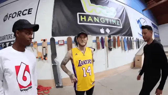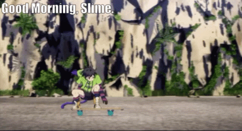 Miya Chinen from Sk8 the Infinity skateboarding with 'Good Morning, Slime' text displayed on screen.