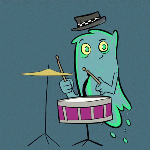 A cartoon monster wearing a hat plays drums, with "Ska" written on the side, implying a musical joke.