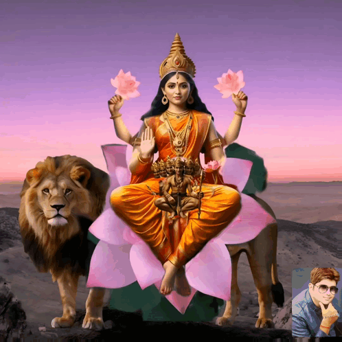 Skandamata, the fifth Navdurga form of Mahadevi, seated on a lotus atop her majestic lion mount, symbolizing motherhood.