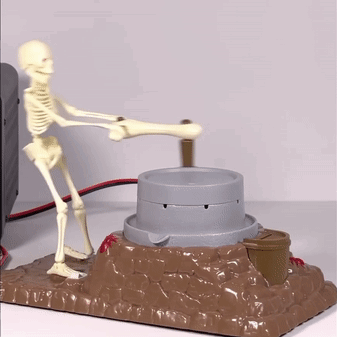 A skeleton toy is seen cranking a gray object with a small bucket on the side, performing a repetitive motion.