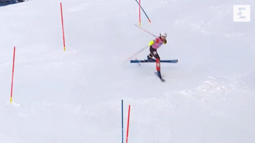 A skier in a pink shirt and yellow accents loses control and crashes during a fast-paced slalom race.