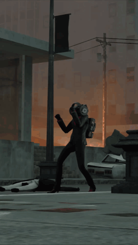 A character resembling a Speaker Woman from Skibidi Toilet performs a dance in a desolate, ruined city.