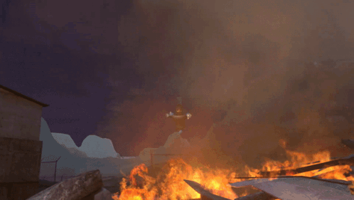 An animated Skibidi Toilet Ski Mask unit flies through a fiery landscape before crashing into a building in a massive explosion.