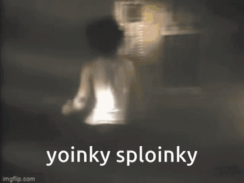 Nivek Ogre of Skinny Puppy in a blurred clip, with the meme text 'yoinky sploinky' overlaid on the screen.