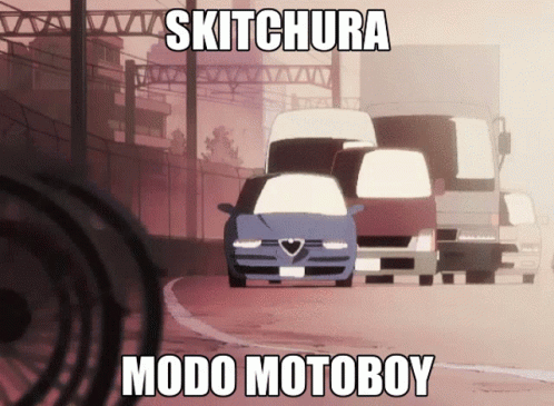 Skitchura in motoboy mode, riding a yellow scooter through chaotic traffic with cars and trucks.