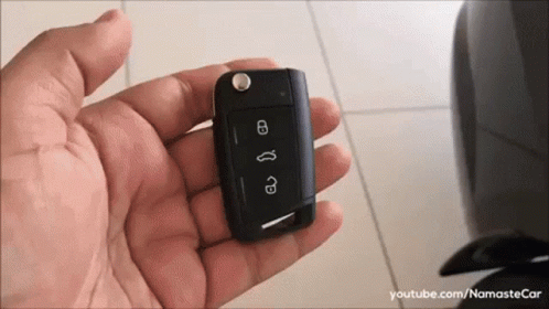 A hand demonstrates the car key for a blue Skoda Fabia hatchback, then reveals the car in a showroom.