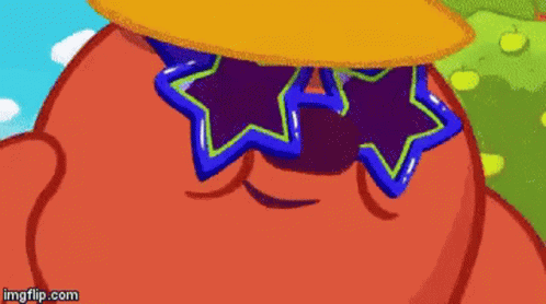 Skofqq, a red cartoon character, wears a yellow hat and distinctive star-shaped blue sunglasses.