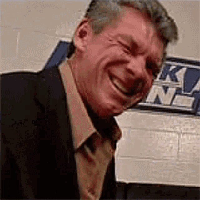 Vince McMahon laughs intensely, leaning back in his chair with a wide, exaggerated smile.