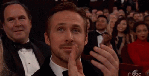 Ryan Gosling applauding with a subtle smile at an awards ceremony, looking up at the stage.