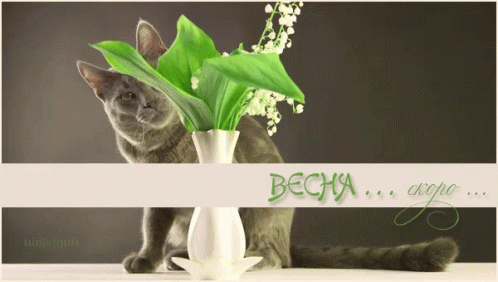 A charming gray cat sits beside a vase filled with delicate lily of the valley flowers, anticipating spring.
