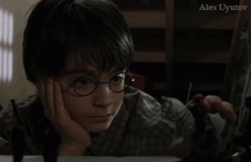 Harry Potter, portrayed by a young boy with glasses, looks intently with a bored expression, featuring Alex Uyutov.